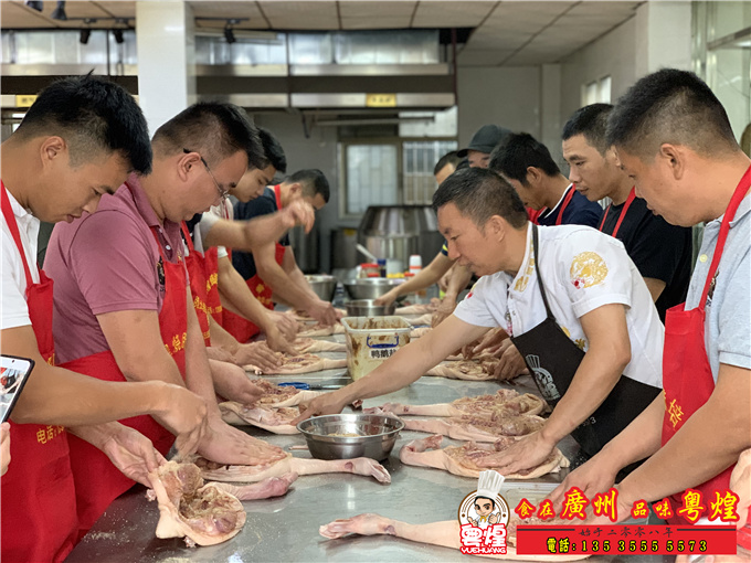 轮流练习给鸭子烫皮过冷水